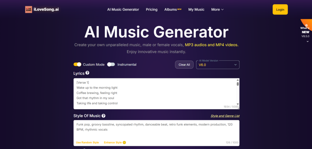 iLoveSong focuses on AI-generated songs with plan-based limits and commercial positioning. It supports longer song generation and structured outputs.